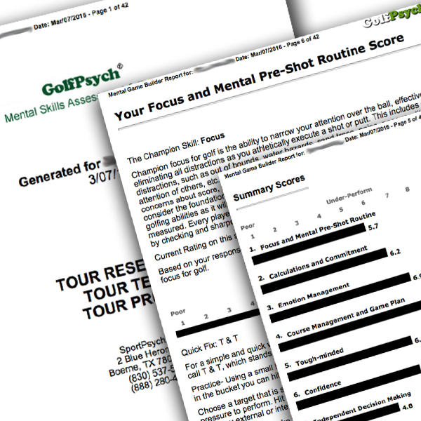 GolfPysch is the premier mental game training system. Jon emphasizes the importance of having a strong mental routine. He provides individual mental game coaching. The first step is ASSESSMENT. You do this with two online Assessments, the first on your Mental Skills for golf and the second comparing your Personality to the 8 Champion Personality Traits discovered through GolfPsych’s research. Both assessments produc